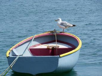 Keywords: rowboat water calm moored nautical wood vessel rowing small scenic outdoor recreation bird seagull gull nature wildlife leisure