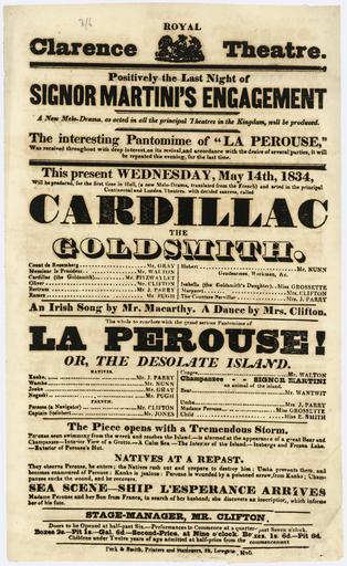 | Keywords: text monochrome writing Arrangements of text, with different sizes of lettering. Cast of "La Perouse" included: Mr J Parry, Mr Nunn, Mr Gray, Mr Pugh, Mr Clifton, Mr Jones, Mr Walton, Signor Martini (as the Ch[i]mpanzee), Mr Wantwit, Mrs J Parry, Miss Grossette, Miss E Smith. Synopsis of "La Perouse" is given thus: "The piece opens with a tremendous storm. Perouse seen swimming from the wreck and reaches the Island - is alarmed at the appearance of a great bear and champanzee [chimpanzee] - interior view of a grotto - a calm sea - the interior of the island - icebergs and frozen lake - exterior of Perouse's hut. Natives at a repast - they observe Perouse, he enters; the natives rush out and prepare to destroy him; Umba prevents them and becomes enamoured of Perouse; Kanko is jealous; Perouse is wounded by a poisoned arrow from Kanko; Ch[i]mpanzee sucks the wound and he recovers. Sea scene - ship L'Esperance arrives. Madame Perouse and her son from France in search of her husband; she discovers an inscription, which informs her of his fate". Inscriptions: Inscribed - Verso - bottom left: Webster Collection 2955. Quantity: 1 b&w art print(s). Physical Description: Letterpress, 320 x 192 mm. Peck & Smith (Firm). Royal Clarence Theatre :Positively the last night of Signor Martini's engagement ... the interesting pantomime of "La Perouse" ... this present Wednesday, May 14th, 1834 ... "Cardillac the goldsmith" ... an Irish song by Mr Macarthy. A dance by Mrs Clifton. The whole to conclude with the grand serious pantomime of "La Perouse! or, The desolate island". The piece opens with a tremendous storm ... natives at a repast ... Peck & Smith, printers and stationers, 38 Lowgate, Hull [1834]. [Collection of ephemera, handbills, fliers, collected by Kenneth Athol Webster. 1800-1920]. Ref: Eph-B-WEBSTER-Theatre-1834-01. Alexander Turnbull Library, Wellington, New Zealand. natlib.govt.nz/records/22709165 Arrangements of text, with different sizes of lettering. Cast of "La Perouse" included: Mr J Parry, Mr Nunn, Mr Gray, Mr Pugh, Mr Clifton, Mr Jones, Mr Walton, Signor Martini (as the Ch[i]mpanzee), Mr Wantwit, Mrs J Parry, Miss Grossette, Miss E Smith. Synopsis of "La Perouse" is given thus: "The piece opens with a tremendous storm. Perouse seen swimming from the wreck and reaches the Island - is alarmed at the appearance of a great bear and champanzee [chimpanzee] - interior view of a grotto - a calm sea - the interior of the island - icebergs and frozen lake - exterior of Perouse's hut. Natives at a repast - they observe Perouse, he enters; the natives rush out and prepare to destroy him; Umba prevents them and becomes enamoured of Perouse; Kanko is jealous; Perouse is wounded by a poisoned arrow from Kanko; Ch[i]mpanzee sucks the wound and he recovers. Sea scene - ship L'Esperance arrives. Madame Perouse and her son from France in search of her husband; she discovers an inscription, which informs her of his fate". Inscriptions: Inscribed - Verso - bottom left: Webster Collection 2955. Quantity: 1 b&w art print(s). Physical Description: Letterpress, 320 x 192 mm. Peck & Smith (Firm). Royal Clarence Theatre :Positively the last night of Signor Martini's engagement ... the interesting pantomime of "La Perouse" ... this present Wednesday, May 14th, 1834 ... "Cardillac the goldsmith" ... an Irish song by Mr Macarthy. A dance by Mrs Clifton. The whole to conclude with the grand serious pantomime of "La Perouse! or, The desolate island". The piece opens with a tremendous storm ... natives at a repast ... Peck & Smith, printers and stationers, 38 Lowgate, Hull [1834]. [Collection of ephemera, handbills, fliers, collected by Kenneth Athol Webster. 1800-1920]. Ref: Eph-B-WEBSTER-Theatre-1834-01. Alexander Turnbull Library, Wellington, New Zealand. natlib.govt.nz/records/22709165 |