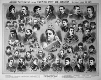 | Keywords: blackandwhite monochrome photo border sport team sport collection black and white Shows head and shoulders portrait of fifty members of the Royal family, including Queen Victoria in the centre, and her late husband Prince Albert. Quantity: 1 colour art print(s). Physical Description: Tinted lithograph, on sheet 446 x 677 mm. Blundell Brothers Ltd. [The Royal family]. Jubilee supplement to the Evening Post, Wellington, Saturday June 18, 1887. Published by Blundell Bros.. Ref: Eph-D-ROYAL-1887-01. Alexander Turnbull Library, Wellington, New Zealand. natlib.govt.nz/records/22895715 Shows head and shoulders portrait of fifty members of the Royal family, including Queen Victoria in the centre, and her late husband Prince Albert. Quantity: 1 colour art print(s). Physical Description: Tinted lithograph, on sheet 446 x 677 mm. Blundell Brothers Ltd. [The Royal family]. Jubilee supplement to the Evening Post, Wellington, Saturday June 18, 1887. Published by Blundell Bros.. Ref: Eph-D-ROYAL-1887-01. Alexander Turnbull Library, Wellington, New Zealand. natlib.govt.nz/records/22895715 |