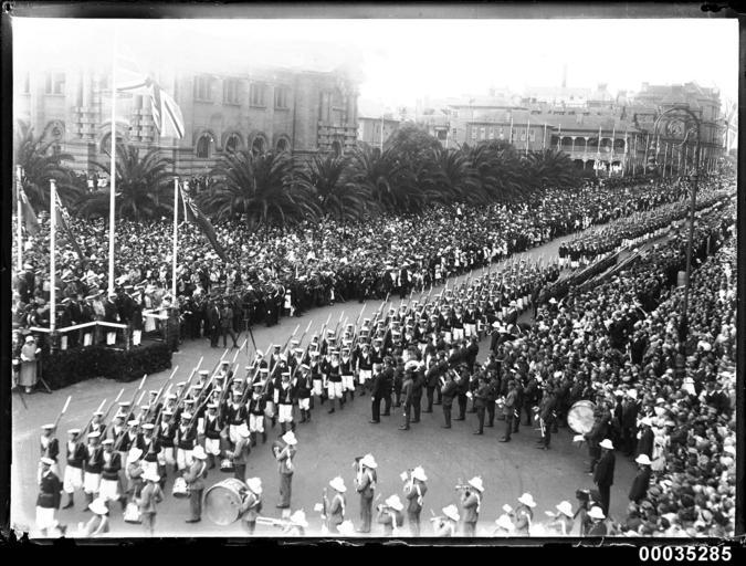 | Keywords: hood collection hoodcollection 35285 samuel j hood collection samueljhoodcollection hood hms hood hmshood hms repulse hmsrepulse royal navy royalnavy navy naval personnel navalpersonnel royal marines band service royalmarinesbandservice 1924 british special service squadron britishspecialservicesquadron sydney sailors macquarie street macquariestreet blackandwhite monochrome black and white From 27 November 1923 to 28 September 1924, the British Royal Navy’s Special Service Squadron cruised around the world visiting and thanking those countries and allies who had offered their support during World War I. It was an opportunity to show naval strength and renew alliances. Samuel J Hood and possibly a number of other photographers belonging to his studio, travelled to various vantage points and photographed the fleet's arrival in Sydney. This photo is part of the Australian National Maritime Museum’s Samuel J. Hood Studio collection. Sam Hood (1872-1953) was a Sydney photographer with a passion for ships. His 60-year career spanned the romantic age of sail and two world wars. The photos in the collection were taken mainly in Sydney and Newcastle during the first half of the 20th century. The ANMM undertakes research and accepts public comments that enhance the information we hold about images in our collection. This record has been updated accordingly. Photographer: Samuel J. Hood Studio Collection Object no. 00035285 From 27 November 1923 to 28 September 1924, the British Royal Navy’s Special Service Squadron cruised around the world visiting and thanking those countries and allies who had offered their support during World War I. It was an opportunity to show naval strength and renew alliances. Samuel J Hood and possibly a number of other photographers belonging to his studio, travelled to various vantage points and photographed the fleet's arrival in Sydney. This photo is part of the Australian National Maritime Museum’s Samuel J. Hood Studio collection. Sam Hood (1872-1953) was a Sydney photographer with a passion for ships. His 60-year career spanned the romantic age of sail and two world wars. The photos in the collection were taken mainly in Sydney and Newcastle during the first half of the 20th century. The ANMM undertakes research and accepts public comments that enhance the information we hold about images in our collection. This record has been updated accordingly. Photographer: Samuel J. Hood Studio Collection Object no. 00035285 |