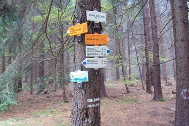 | Keywords: Rozcestí U Antonína.jpg cs Turistický rozcestník U sv Antonína les mezi Svorem a Kytlicemi Lužické hory own Zákupák 2011-10-22 50 48 11 515 N 14 34 14 674 E region CZ Hiking and footpath fingerposts in Česká Lípa District Rousínov Svor Lusatian Mountains Altitude signs of KČT marking |