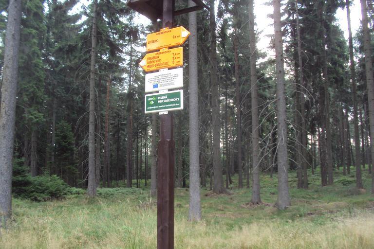 Keywords: Rozcestník Lyžařská hřebenovka.JPG cs Lužické hory východ poblíž Popovy skály a Hrádku nad Nisou own Zákupák 2013-08-31 Hiking and footpath fingerposts in Liberec District Lusatian Mountains Dolní Sedlo