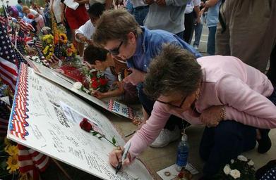 | Keywords: RRFUNERAL-mourners write.jpg http //www navy mil/view_image asp id 14757 source Mourners write their condolences on a memory board for former President Ronald Reagan at the gate of the Ronald Reagan Presidential Library in Simi Valley Calif --June 7 2004 PD-USGov-Military-Navy people writing Death and state funeral of Ronald Reagan Mourning |