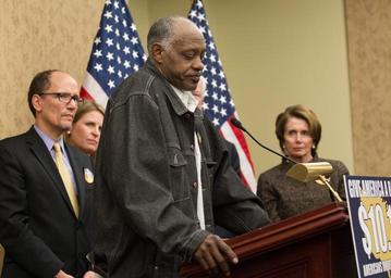 | Keywords: Ruben Jones speaks about minimum wage in the US, 2014 (1).jpg Ruben Jones full time cook at the Golden Coral Restaurant a low-wage worker who spoke about his struggles to make ends meet working minumum wage jobs during a stop of the 'Give America a Raise' bus tour at the U S Capitol Building on April 3 2014 in Washington DC 3 April 2014 -Washington DC - Secretary of Labor Thomas Perez gives remarks at the Americans United for Change Bus Tour Stop at the U S Capitol On hand for the event was Harry Reid Senate Majority Leader U S Senate; Nancy Pelosi Minority Leader U S House of Representatives; Senator Tom Harkin; Representative George Miller; Senator Al Franken Lee Saunders AFSCME President; Liz Shuler AFL-CIO Secretary-Treasurer; Ruben Jones full time cook at the Golden Coral Restaurant; Anna Hovland Tipped server at two local DC Restaurants; and Gina Schaefer Owner of 9 Ace Hardware stores in DC and Maryland Official Department of Labor Photograph This official Department of Labor photograph is being made available only for publication by news organizations and/or for personal use printing by the subject s of the photograph The photograph may not be manipulated in any way and may not be used in commercial or political materials advertisements emails products and/or promotions that in any way suggest approval or endorsement of the Secretary or the Department of Labor Photo Credit Department of Labor https //www flickr com/photos/usdol/13608832013/ AF8E1607 2014-04-03 11 34 https //www flickr com/people/52862363 N07 US Department of Labor PD-USGov US Department of Labor https //flickr com/photos/52862363 N07/13608832013 2016-09-06 06 57 12 United States Government Work Thomas Perez in 2014 Liz Shuler Ruben Jones Nancy Pelosi in 2014 |