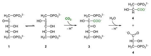 | Keywords: RuBisCO reaction.svg en reactions catalyzed by RubisCO carboxylation of ribulose-1 5-bisphosphate 1 to 3-Phosphoglycerate 4 de die durch RubisCO katalysierte Carboxylierung von Ribulose-1 5-bisphosphat 1 ; Endiol 2 ; 2-Carboxy-3-keto-arabinitol-1 5-bisphosphat 3 zu 3-Phosphoglycerat 4 Own Yikrazuul 2009-06-01 Carbon fixation SVG photosynthesis |