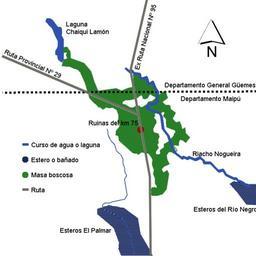 | Keywords: Ruinas del km 75 map.png en A map showing area of Ruinas del km 75 Chaco province Argentina which correspond to Concepción del Bermejo city Concepción del Bermejo existed between 1585 and 1632 Legends in English from up to down stream or lagoon; marsh; forest; road es Mapa del área circundante de las Ruinas del kilómetro 75 departamento Maipú provincia del Chaco Argentina que corresponde a la extinta ciudad de Concepción del Bermejo 1585-1632 Own creation based on a map published by Eldo Morresi in 1971 2007-10-11 User Pertile in es wikipedia Public domain Concepción del Bermejo Maps of Chaco |