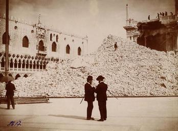 | Keywords: Ruins of St Mark's Campanile.jpg Ruins of St Mark's Campanile Le rovine del campanile di San Marco a Venezia dopo il crollo il 14 luglio 1902 Руины Кампанилы собо а Святого а ка http //www muar ru/press_dossier/rogoz5/rog5_7 jpg Shchusev State Museum of Architecture 1902-07-14 author PD-old Collapse of Campanile of St Mark's Basilica Venice People of Venice 1902 |