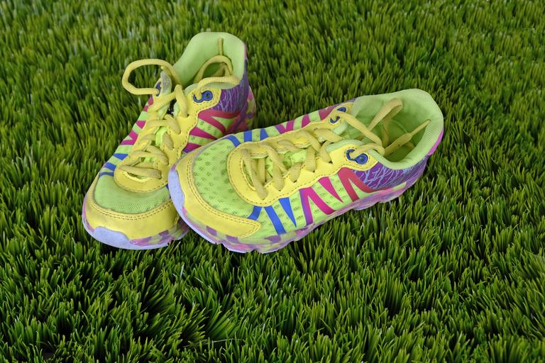 Keywords: running shoes race sport run jog shoes sports shoes shoelaces lacing endurance jogging shoes jogging fit foot competition condition speed running track neon yellow colorful meadow