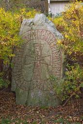 | Keywords: sweden haninge västerhaninge runsten stav geotagged runestone runor runes sverige outdoor Lite gömd i en häck i byn Stav så står det en runsten med en enkel slinga som börjar och slutar i ett kors. Runraden lyder "+ auþa + raisti + stain : at : haralt . buata . sin : auk . fastlauk . at + faþur sin" Det finns ingen skylt på platsen och min översättning lyder, "Autha reste stenen efter Harald, buata? sin och Fastlauk efter sin fader". Buata sägs betyda bonde eller husbonde, en annan sak som man skall notera är hur ofta runristaren har bytt avskiljningstecken mellan orden och att runraden delar ett avskiljningstecken där runraden börjar. Korset är typiskt för Amunde och även självaste tekniken liknar Amunde som jag skulle nog gissa att det är Amunde som ristat denna sten. (RAÄ Västerhaninge 7:1) Lite gömd i en häck i byn Stav så står det en runsten med en enkel slinga som börjar och slutar i ett kors. Runraden lyder "+ auþa + raisti + stain : at : haralt . buata . sin : auk . fastlauk . at + faþur sin" Det finns ingen skylt på platsen och min översättning lyder, "Autha reste stenen efter Harald, buata? sin och Fastlauk efter sin fader". Buata sägs betyda bonde eller husbonde, en annan sak som man skall notera är hur ofta runristaren har bytt avskiljningstecken mellan orden och att runraden delar ett avskiljningstecken där runraden börjar. Korset är typiskt för Amunde och även självaste tekniken liknar Amunde som jag skulle nog gissa att det är Amunde som ristat denna sten. (RAÄ Västerhaninge 7:1) |
