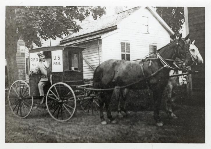 Keywords: smithsonian institution smithsonianinstitution horse carriage greenfield rural harness transportation greenfield, massachusetts greenfieldmassachusetts rural free delivery carriers ruralfreedeliverycarriers buggy tak tack vintage house and buggy vintagehouseandbuggy mail delivery maildelivery national postal museum nationalpostalmuseum mail across the commons mailacrossthecommons outdoor Description: An unidentified rural letter carrier in his wagon stops near a mailbox on his route near Greenfield, Massachusetts. Creator/Photographer: Unidentified photographer Medium: Black and white photographic print Culture: American Geography: USA Date: 1900 Collection: U.S. Postal Employees Persistent URL: arago.si.edu/index.asp?con=2&cmd=1&id=194276 Repository: National Postal Museum Accession number: A.2006-24 Description: An unidentified rural letter carrier in his wagon stops near a mailbox on his route near Greenfield, Massachusetts. Creator/Photographer: Unidentified photographer Medium: Black and white photographic print Culture: American Geography: USA Date: 1900 Collection: U.S. Postal Employees Persistent URL: arago.si.edu/index.asp?con=2&cmd=1&id=194276 Repository: National Postal Museum Accession number: A.2006-24 |