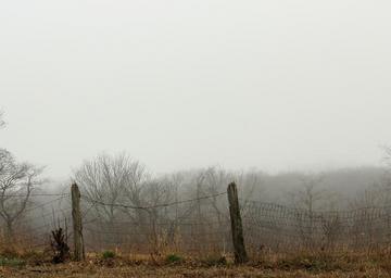 Keywords: rural country fence post wood wire fog mist grey dreary nature field yellow decay borderline