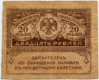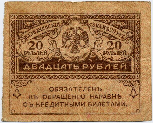 Keywords: Russia-1917-Banknote-20-Obverse.png Provisional Government of Russia banknote 1917 20 rubles obverse Казначейский знак В еменного п авительства России 1917 год 20 ублей лицевая сто она own <br /> Banknote is courtesy of collector who wants to remain anonymous Thank you Банкнота п едоставлена коллекционе ом пожелавшим остаться анонимным Спасибо 1917 Provisional Government of Russia PD-RusEmpire PD-old currency Banknotes of Russia 1917 Banknotes with a face value of 20 Brown banknotes |