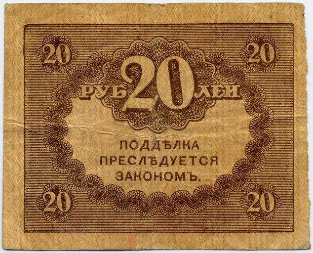 | Keywords: Russia-1917-Banknote-20-Reverse.png Provisional Government of Russia banknote 1917 20 rubles reverse Казначейский знак В еменного п авительства России 1917 год 20 ублей об атная сто она own <br /> Banknote is courtesy of collector who wants to remain anonymous Thank you Банкнота п едоставлена коллекционе ом пожелавшим остаться анонимным Спасибо 1917 Provisional Government of Russia PD-RusEmpire PD-old currency Banknotes of Russia 1917 Banknotes with a face value of 20 Brown banknotes | ||||