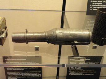 | Keywords: Russia hand grenade, Model 1914 bottle type - National World War I Museum - Kansas City, MO - DSC07626.JPG Hand grenade exhibit in the National World War I Museum at the Liberty Memorial 100 W 26th Street Kansas City Missouri USA Photography was permitted in the museum without restriction Daderot 2011-11-01 14 29 37 Daderot Hand grenades in the National World War I Museum Model 1914 grenade | ||||