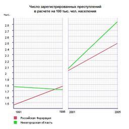 Keywords: Russia-NN crime chart.png en Chart of the crime rate in Russia in 1991 1996 and 2001 2005 Data based on http //www gks ru/dbscripts/Cbsd/DBInet cgi pl 2318002 Federal State Statistics Service ru Г афик числа за егист и ованных п еступлений в России и ижего одской области в пе иоды 1991 1996 и 2001 2005 Использованы данные http //www gks ru/dbscripts/Cbsd/DBInet cgi pl 2318002 Феде альной службы госуда ственной статистики own Ivan Simochkin 2009-04-22 Law of Russia |
