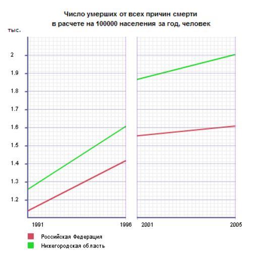 Keywords: Russia-NN death rate.png en Chart of death rates in <span style background-color d6495e >Russia</span> and <span style background-color 21da2a >Nizhny Novgorod Oblast</span> in 1991 1996 and 2001 2005 Data based on http //www gks ru/dbscripts/Cbsd/DBInet cgi pl 2415011 Federal State Statistics Service ru Г афик у овня сме тности в <span style background-color d6495e >России</span> и <span style background-color 21da2a > ижего одской области</span> в пе иоды 1991 1996 и 2001 2005 Использованы данные http //www gks ru/dbscripts/Cbsd/DBInet cgi pl 2415011 Феде альной службы госуда ственной статистики Own Ivan Simochkin 2009-04-22 graph Demographics of Russia Birth and death rates |