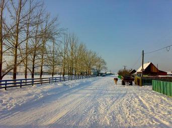 Keywords: russia village sky clouds winter snow ice cart cow farm rural road nature outside buildings