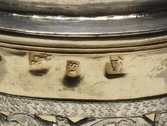 | Keywords: Russian - Covered Cup with Large Foot - Walters 57807 - Mark A.jpg Around the body of the cup is a silver envelope with pierced designs and three portrait medallions in repoussé The finial of the cover is designed as a double-headed eagle 1745 Early Modern silver parcel gilt cm 14 7 accession number 57 807 24053 Alexandre Polovtsoff Aleksandr Aleksandrovich Polovtsov St Petersburg and Paris by purchase Henry Walters city Baltimore Walters Art Museum Henry Walters Acquired by Henry Walters 1930 Bears the marks of an unknown maker 'VD' who was active 1741-1753 It also bears the assayer's mark of Andrei Zaitsev who was active from 1735-1749 Several marks on rim Moscow 1745 Russian Art Icons and Decorative Arts from the Origin to the Twentieth Century The Walters Art Gallery Baltimore 1959-1960 place of origin Moscow Russia Walters Art Museum license Decorative and applied arts of Russia Media contributed by the Walters Art Museum needs category review Collections of the Walters Art Museum Hallmarks from Russia |