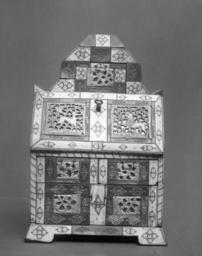 | Keywords: Russian - Desk with Animals and Decoration - Walters 71429.jpg This seven-drawer miniature writing desk is known as a teremok small tower cabinet Flat walrus-ivory and bone plaques some of which have been stained moss green are affixed by nails to the cabinet's front and sides and to the fronts of the three interior drawers Their surface is busily decorated with circle motifs and colored black Twelve thicker plaques carved with rocaille floral openwork decoration typical of the mid 18th century north Russian School have been set over mica sheets on the exterior drawer fronts sides and top The two largest of these plaques are set into the sloping drop-front They include on the right a lion and on the left a doe and swooping bird within the stylized floral matrix Several of the plaques are chipped or cracked On the back on a paper tag is written 130; engraved on the bottom of the left front foot is the date 1812 early Other date century 19 wood walrus ivory and bone cm 29 5 25 11 accession number 71 429 5269 Scandinavia William T / Henry Walters Collection Baltimore date of acquisition unknown by purchase Walters Art Museum Henry Walters Acquired by William T or Henry Walters Number On the back on a paper tag 130; Date Engraved on the bottom of the left front foot 1812 Russian Art Icons and Decorative Arts from the Origin to the Twentieth Century The Walters Art Gallery Baltimore 1959-1960 A Millennium of Christianity Russian Art from The Walters Art Gallery The Walters Art Gallery Baltimore 1988-1989 place of origin north Russia Walters Art Museum license Slant-front desks Ivory objects Walrus ivory 19th-century furniture desks Decorative and applied arts of Russia Furniture in the Walters Art Museum Writing desks |
