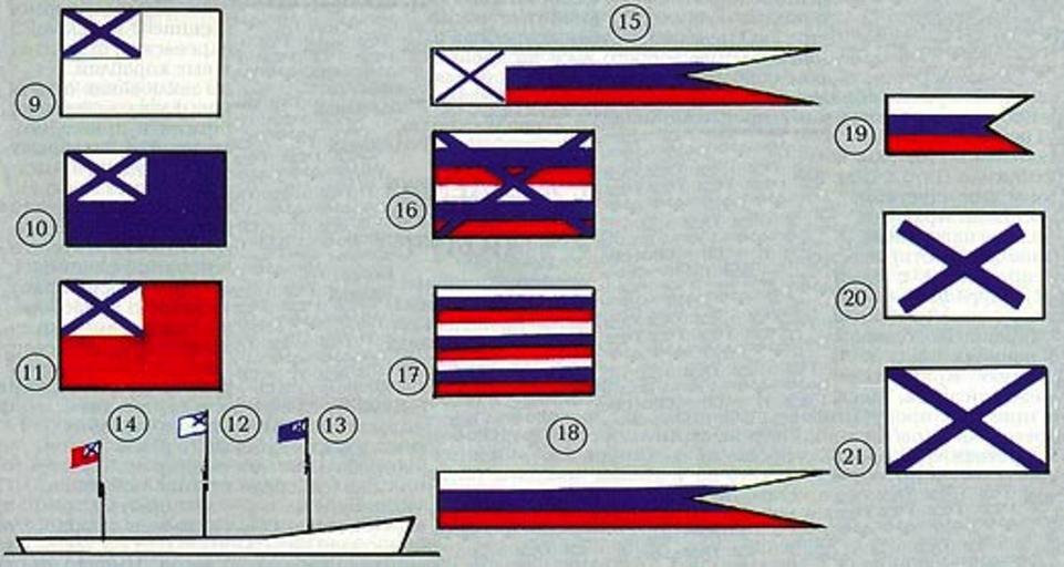 | Keywords: Russian Navy Flag Chart 1700 part 2.jpg en Russian Navy Flag Chart 1700 part 2 9 Flag of Admiral's Squadron Main fleet 1700-1712 10 Flag of Vice Admiral's Squadron Avant-garde 1700-1865 Auxilliary Naval Ensign 11 Flag of Rear Admiral's Squadron Rear Guard 1700-1865 12 First Admiral flag on Grots-Tenge 13 Vice-Admiral flag on Fore-topmast 14 Rear-Admiral flag on Cruys-topmast 15 Ordinary captain's pennant of Russia 1720-1870 16 Transition flags pattern 1698-1700 17 Flag of Russia 9 Stripes 18 Pennant 1700 19 Pennant 1700 20 Naval Ensign 1710-1712 21 Naval Ensign St Andrew flag ru Русский флот Флаг Диаг амма 1700 часть 1 9 Флаг адми ала эскад илья ко дебаталии 1700 1712 10 Флаг вице-адми ала эскад илья аванга да 1700 1865 «Флаги вспомогательных судов» 11 Флаг конт -адми ала эскад илья а ье га да 1700 1865 12 Адми альский флаг поднимался на г отс-теньге 13 вице-адми альский на фо -стеньге 14 конт -адми альский на к юйс-стеньге 15 О дина ный капитанский вымпел 1720-1870 16 Флаги пе еходного исунка 1698 1700 17 Флаг России девятью полосами 18 Пе вый вымпел до 1700 19 Пе вый вымпел до 1700 20 Ко мовой флаг 1710-1712 21 Ко мовой Анд еевский флаг 1700 http //www vokrugsveta ru/vs/article/1250/ unknown other versions PD-RusEmpire Flag charts by Russian Navy Naval flags of the Russian Empire |