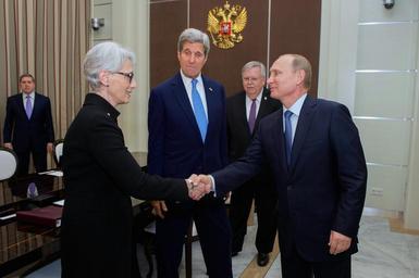 | Keywords: Russian President Putin Greets Under Secretary Sherman Before Bilateral Meeting in Sochi.jpg en Russian President Vladimir Putin watched by U S Secretary of State John Kerry and U S Ambassador to Russia John Tefft shakes hands with U S Under Secretary of State for Political Affairs Wendy Sherman at the Bocherov Ruche - a government villa - in Sochi Russia before a bilateral meeting on May 12 2015 State Department photo/ Public Domain 2015-05-12 09 56 00 http //www flickr com/photos/9364837 N06/17558868402/ U S Department of State other versions 43 618182 39 721069 PD-USGov PD-USGov Bilateral relations of the United States Uploaded with UploadWizard |
