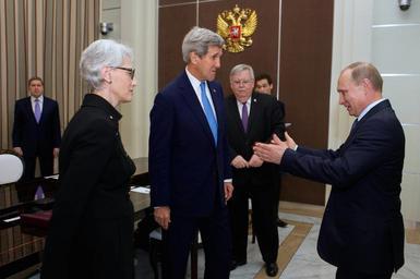 | Keywords: Russian President Putin Guides Secretary Kerry, Under Secretary Sherman, Ambassador Tefft to Seats Before Bilateral Meeting in Sochi.jpg en Russian President Vladimir Putin watched by U S Secretary of State John Kerry U S Under Secretary of State for Political Affairs Wendy Sherman and U S Ambasador to Russia John Tefft urges his guests to take their seat at the Bocherov Ruche - a government villa - in Sochi Russia before a bilateral meeting on May 12 2015 State Department photo/ Public Domain 2015-05-12 09 56 01 http //www flickr com/photos/9364837 N06/17373381508/ U S Department of State other versions 43 618182 39 721069 PD-USGov PD-USGov Bilateral relations of the United States Uploaded with UploadWizard |