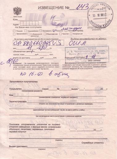 Keywords: RussiaParcel2008.jpg Russia Package Mailing form front and reverse side 2008 Чистый бланк почтового отп авления посылки России лицевая и об атная сто она 2008 год own Nickpo 2008-10-17 PD-RU-exempt PD-trivial Post of Russia