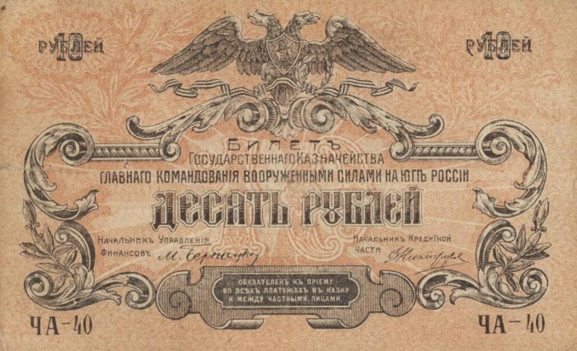 | Keywords: RussiaPS421-10Rubles-1919 f.jpg Деникинки 10 ублей 1919 аве с Казначейство ВСЮР 1919 год http //www russianbon nm ru/article/ugr/17 htm PD-old-auto-1923 1919 currency Original upload log ru wikipedia ftcg page ru wikipedia RussiaPS421-10Rubles-1919_f jpg wikitable - 05 16 23 September 2007 700 × 426 128 937 bytes Vizu w ru <nowiki> Описание Авто В емя создания Источник </nowiki> Banknotes of the Armed Forces of South Russia Banknotes of Russia 1919 Banknotes with a face value of 10 | ||||