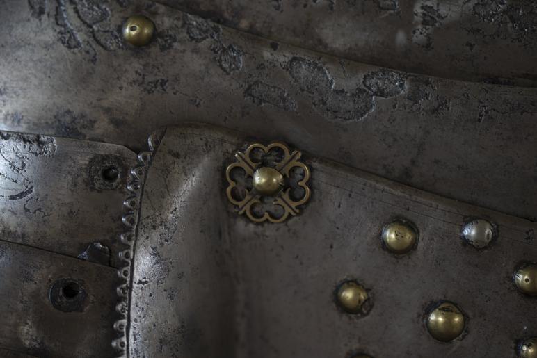 Keywords: Rustning och nitar, 1500-talets slut - Skoklosters slott - 100605.tif LSH artwork sv Helrustning ej komplett Alla delar stämplade med Augustburgs pinjekotet och sax Enligt 1930 års katalogkort även med initialerna C S har ej kunnat upptäckas nu 1500-talets slut <br/>Bestående av 19760819 <br/>Bröstharnesk 14855 1<br/>Ryggharnesk 14855 2<br/>Ringkrage 14855 3<br/>ländskört 14855 4<br/>h axelstycke med armskydd 14855 5<br/>h handske 14855 6<br/>v axelstycke med armskydd 14855 7<br/>h lårskena med knäbuckla 14855 8<br/>v lårskena med knäbuckla 14855 9<br/>hjälm 14855 10<br/>v handske 14855 11<br/>14855 1 Bröstharnesk Låg rundad snedräfflad halshanr Dubbla graverade linjer kring hals armar och nedre kant Svagt markerad mittås Två mässingsnitar i nederkanten - för att fösta tassetterna vilka nu saknas Har troligen haft dekor av mässingsnitar utmed nederkanten Spår finnes Fastnitade läderremmar vid axlarna - att spännas vid ryggstycket <br/>H 380 mm bröstvidd 500 mm <br/>14855 2 Ryggharnesk Låg rundad snedräfflad halskant Graverade linjer på motsvarande sätt som bröstharneskets axelstycken I midjans högra sida fastnitad vit sämskad rem - spår av läderrem i vänster sida finnes <br/>H 365 mm ryggvidd 530 mm <br/>14855 3 Ringkrage med halskrage bestående av tre lameller upptill avslutad med snedräfflad kant Mässingsnitar Fodrad med vitt matlareat tyg kantat med röd sammet <br/>14855 4 Ländskört Bestående av fem lameller med mässingsnitar Påhakat vid ryggharnesket på högra sidan spärrat med hake <br/>H 180 mm b 870 mm <br/>Tillbehör Stativ nr 14866<br/>14855 5-7 11 Axelstycken med armskydd och till hörande handskar Axelstycket består av fem lameller - ryggbladen stora De sidor som går in över överarmsskyddet har tandad kant Främre nedre lamellen med mässingsros saknas på 14855 7 Axelskydd med mässingsfodrat spänne i vilket rem från ringkragen spännes Armbucklan med snidad lotusblomma Handske nr 14855 6 är komplett med stelt handledsskydd och hand-och fingerskydd T o m främre knogen bestående av lameller 14855 11 saknar de sex främre lamellerna med knogskydd 14855 11 har röd sammetskantad överkant - saknas på 14855 6 <br/>L armskydd 770 mm diam 470 mm l handske 67 mm fel mått diam 97 fel mått mm<br/>14855 8-9 Lårskenor med knäbucklor Lårskenan i två delar Den övre bestående av 4 lameller - den undre av en hel skena med knäbuckla av 8 lameller nr 14855 8 saknar nedersta delen Skarven mellan de båda delarna ornerade med räffelgraverad rund kant Dekor av graverade linjer och mässingsnitar <br/>L 520 mm b 360 mm <br/>14855 10 Hjälm visir hjälm låg mjuk rundad kant Utan hjälmkrage nertill avslutad med liten kant räffelgraverad Högra sidan med stödstång för visiret Invändigt korsade hjässremmar av sämskat skinn <br/>H 300 mm original caption Rustning och nitar 1500-talets slut <br/> Nyckelord Nitar Grått Stål 1500-tal Rustning end other date century 16 size mm 1040 SKO C S place of origin original filename sm_dig15699 35687 inventory number SKO 14855 100605 CC-BY-SA Miguel Herranz <gallery caption Different images of same object > File Rustning 1500-talets slut - Skoklosters slott - 100602 tif File Rustningshandske 1500-talets slut - Skoklosters slott - 100608 tif File Armskydd till rustning 1500-talets slut - Skoklosters slott - 100607 tif File Hjälmvisir 1500-talets slut - Skoklosters slott - 100603 tif File Rustning och nitar 1500-talets slut - Skoklosters slott - 100609 tif File Hjälmvisir 1500-talets slut - Skoklosters slott - 100604 tif File Rustning och nitar 1500-talets slut - Skoklosters slott - 100606 tif </gallery> Steel Gray Armour Rivets 16th century Miguel Herranz Media contributed by LSH 2015-11 Arms and armour in the Skokloster Castle |