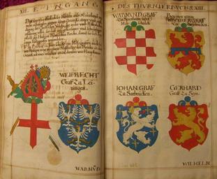 | Keywords: Rüxner Turnierbuch Abschrift 17Jh 26.jpg Um Zusätze vermehrte Abschrift von Sigmund Feyerabends Frankfurter Ausgabe 1578/1579 des Turnierbuchs von Georg Rüxner Jörg Rugen Handschrift auf Papier in zwei Bänden 17 Jahrhundert <br /><br />Detail http //www neumann-walter de via ebay de century 17 anonymous PD-Art Rüxners Turnierbuch Abschrift 17 Jh Coats of arms of Sponheim family Coats of arms from Zweibrücken Coats of arms of Leiningen family Coats of arms of County of Saarbrücken Coats of arms of Sayn family Trier See coat of arms |
