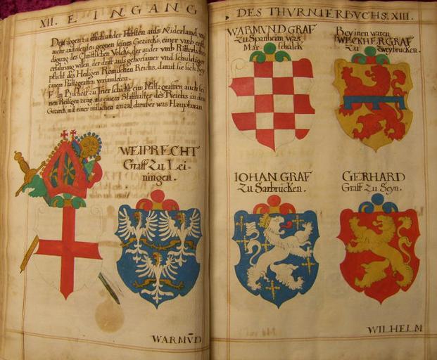 Keywords: Rüxner Turnierbuch Abschrift 17Jh 26.jpg Um Zusätze vermehrte Abschrift von Sigmund Feyerabends Frankfurter Ausgabe 1578/1579 des Turnierbuchs von Georg Rüxner Jörg Rugen Handschrift auf Papier in zwei Bänden 17 Jahrhundert <br /><br />Detail http //www neumann-walter de via ebay de century 17 anonymous PD-Art Rüxners Turnierbuch Abschrift 17 Jh Coats of arms of Sponheim family Coats of arms from Zweibrücken Coats of arms of Leiningen family Coats of arms of County of Saarbrücken Coats of arms of Sayn family Trier See coat of arms |