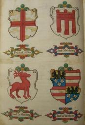 | Keywords: Rüxner Turnierbuch Abschrift 17Jh 61.jpg Um Zusätze vermehrte Abschrift von Sigmund Feyerabends Frankfurter Ausgabe 1578/1579 des Turnierbuchs von Georg Rüxner Jörg Rugen Handschrift auf Papier in zwei Bänden 17 Jahrhundert <br /><br />Detail http //www neumann-walter de via ebay de century 17 anonymous PD-Art Rüxners Turnierbuch Abschrift 17 Jh Trier See coat of arms Coats of arms of Werdenberg family Coats of arms of Wertheim family Coats of arms of families of Germany - H Hirschberg | ||||