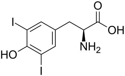 | Keywords: (S)-2-amino-3-(4-hydroxy-3,5-diiodophenyl)propanoic acid 200.svg validSVG Structure of S -2-amino-3- 4-hydroxy-3 5-diiodophenyl propanoic acid Own 2014-05-02 Emeldir <span class signature-talk >talk</span> Chemical structure verified https //upload wikimedia org/wikipedia/commons/e/e8/ 28S 29-2-amino-3- 284-hydroxy-3 2C5-diiodophenyl 29propanoic_acid_200 svg 1S/C9H9I2NO3/c10-5-1-4 2-6 11 8 5 13 3-7 12 9 14 15/h1-2 7 13H 3 12H2 H 14 15 /t7-/m0/s1 NYPYHUZRZVSYKL-ZETCQYMHSA-N 300-39-0 Synonyms <small> S -2-Amino-3- 4-hydroxy-3 5-diiodophenyl propanoic acid dihydrate 3 5-Diiodo-4-hydroxy-beta-phenylalanine 3 5-Diiodo-beta- p-hydroxyphenyl -L-alanine dihydrate 3 5-Diiodo-beta- p-hydroxyphenyl alanine 3 5-Diiodo-L-tyrosine 3 5-diiodo-L-tyrosine 3 5-Diiodo-L-tyrosine dehydrate 3 5-Diiodo-l-tyrosine dihydrate 3 5-Diiodo-L-tyrosine dihydrate 3 5-Diiodo-L-tyrosine hydrate 3 5-Diiodotyrocine 3 5-Diiodotyrosine 3 5-Iodo-L-tyrosine 3 5-L-Diiodotyrosine Agontan DIIODO-L-TYROSINE Dityrin H-3 5-Diiodo-Tyr-OH H-D-Tyr 3 5-DiI -OH H-L-Tyr 3 5-I2 -OH H-Tyr 3 5-DiI -OH H-Tyr 3 5-I2 -OH H-Tyr 3 5-I2 -OH H2O Iodogorgoic acid L-3 5-DiioDOTyrosine L-Tyrosine 3 5-diiodo- 9CI TRYOSINE 3 5-DIIODO- Tyrosine 3 5-diiodo- L- 8CI </small> PD-chem Iodinated tyrosine derivatives |