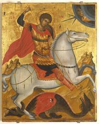 | Keywords: S.George (Candia, late 15th c.).jpg Ο Άγιος Γεώργιος έφι ος δρακοντοκτόνος τέλη 15ου αιώνα 65 5x82 5εκ άγνωστος ζωγράφος του Χάνδακα Στην εικόνα αυτή αριστάνεται ο άγιος Γεώργιος με στρατιωτική εξάρτυση και έφι ος τη στιγμή ου σκοτώνει τον φτερωτό δράκοντα με το δόρυ του Α ό το τεταρτοκύκλιο του ουρανού ροβάλλει το χέρι του Θεού ου τον ευλογεί Πρόκειται για το ιο δημοφιλές θαύμα του αγίου το ο οίο στο βίο του συσχετίζεται με την α ελευθέρωση της όλης της Λασίας α ό τον δράκοντα και τη διάσωση της μικρής ριγκί ισσας http //eib xanthi ilsp gr/gr/icons asp cursort iconTitle selectFieldValue vpage 3 late 15th century unknown painter of Candia Icons of Saint George and the Dragon 1490 Files uploaded by Shakko from various sources Icons of Candia 15th-century icons of Byzantine Empire Paintings of coats of arms PD-old |
