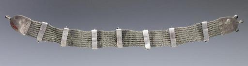 | Keywords: Sa - Woman's Headband - Walters 572309 - Back.jpg The broad silver headband consists of a flexible tightly interlaced band which has shield-shaped end-pieces and seven movable retainers with rhombic elements End-pieces and retainers are executed in embossing and filigree technique; in addition they are gilded and the background is filled with green enamel The floral decor on the end pieces combines different shaped leaves and stalks; and the rhombic elements display four three-foil attachments arranged around a central five-ball granulation cluster The motifs of the end-pieces and retainers are framed with bead-molding borders Such silver headbands formed the basis of a woman's headpiece The large loops at the end-pieces were used to fix the band at the headscarf and the smaller loops on the rhombic elements to fasten smaller often ball-shaped dangles Headpieces such as this were common in northern regions of Yemen The back of the end pieces has an Arabic stamp with the name of the ruling imam and the date al-Mahdi 1171 Al-Mahdi al- Abbas was the imam of Yemen from AH 1161 to 1189 AD 1748-1775 and belonged to then Qasimid family In 1762/63 he met the German explorer Carsten Niebuhr who reported on this encounter An engraving in Hebrew on the back of the other end-piece names the silversmith Sa'id Iraqi The Hebrew script clearly states that the silversmith was Jewish and the name indicates that he or his family originally came from Iraq 1171 AH/AD 1757-1758 silver with gilding and enamel L 15 3/4 x W of end-pieces 1 3/16 in 40 x 3 cm accession number 57 2309 80913 Mr Benjamin Zucker Zucker Family Trust and Mr Derek Content New York and London by purchase Walters Art Museum Joint gift to the Walters Art Museum Baltimore and the Israel Museum Jerusalem by Mr Benjamin Zucker and Mr Derek Content in honor of Mrs Barbara Zucker and Mrs Amanda Content 2010 Stamp In Arabic al-Mahdi 1171; Engraved In Hebrew Sa'id 'Iraqi place of origin Raydah Yemen Walters Art Museum license Jewellery in the Walters Art Museum South Arabian art in the Walters Art Museum Sa'id 'Iraqi Media contributed by the Walters Art Museum needs category review |