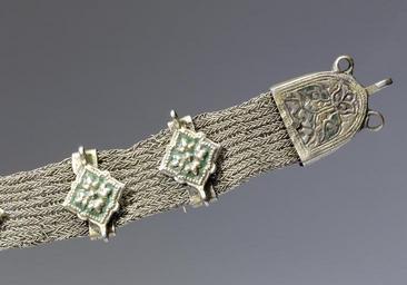 | Keywords: Sa - Woman's Headband - Walters 572309 - Detail A.jpg The broad silver headband consists of a flexible tightly interlaced band which has shield-shaped end-pieces and seven movable retainers with rhombic elements End-pieces and retainers are executed in embossing and filigree technique; in addition they are gilded and the background is filled with green enamel The floral decor on the end pieces combines different shaped leaves and stalks; and the rhombic elements display four three-foil attachments arranged around a central five-ball granulation cluster The motifs of the end-pieces and retainers are framed with bead-molding borders Such silver headbands formed the basis of a woman's headpiece The large loops at the end-pieces were used to fix the band at the headscarf and the smaller loops on the rhombic elements to fasten smaller often ball-shaped dangles Headpieces such as this were common in northern regions of Yemen The back of the end pieces has an Arabic stamp with the name of the ruling imam and the date al-Mahdi 1171 Al-Mahdi al- Abbas was the imam of Yemen from AH 1161 to 1189 AD 1748-1775 and belonged to then Qasimid family In 1762/63 he met the German explorer Carsten Niebuhr who reported on this encounter An engraving in Hebrew on the back of the other end-piece names the silversmith Sa'id Iraqi The Hebrew script clearly states that the silversmith was Jewish and the name indicates that he or his family originally came from Iraq 1171 AH/AD 1757-1758 silver with gilding and enamel L 15 3/4 x W of end-pieces 1 3/16 in 40 x 3 cm accession number 57 2309 80913 Mr Benjamin Zucker Zucker Family Trust and Mr Derek Content New York and London by purchase Walters Art Museum Joint gift to the Walters Art Museum Baltimore and the Israel Museum Jerusalem by Mr Benjamin Zucker and Mr Derek Content in honor of Mrs Barbara Zucker and Mrs Amanda Content 2010 Stamp In Arabic al-Mahdi 1171; Engraved In Hebrew Sa'id 'Iraqi place of origin Raydah Yemen Walters Art Museum license Jewellery in the Walters Art Museum South Arabian art in the Walters Art Museum Sa'id 'Iraqi Media contributed by the Walters Art Museum needs category review |