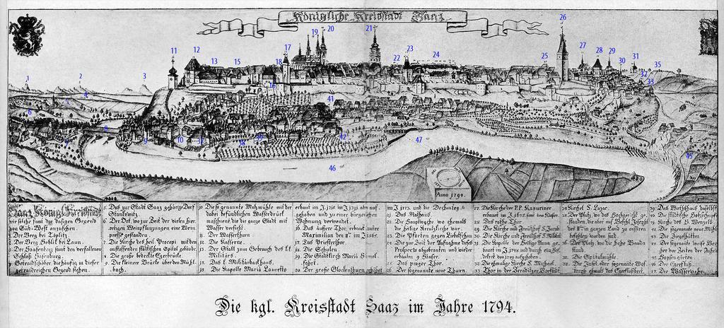 | Keywords: Saaz-Stich1794.jpg  de Die königliche Kreisstadt Saaz im Jahre 1794 aus Adolf Seifert Die Stadt Saaz im 19 Jahrhundert Saaz 1902 Beschreibung Saaz “ Königliche Kreisstadt wie solche samt der dasigen Gegend von Süd-West anzusehen 1 Der Berg bei Töplitz 2 Der Berg Hoblik bei Laun 3 Der Hasenberg samt dem verfallenen Schloss Hasenburg 4 Getreideschöber die häufig in dieser getraidreichen Gegend stehen 5 Das zur Stadt Saaz gehörige Dorf Stankowitz 6 Der Ort wo zur Zeit der vielen hier ortigen Weinpflanzungen eine Weinpresse gestanden 7 Die Kirche des hl Procopi mit dem anstoßenden städtischen Spitalgebäude 8 Die große bedeckte Egerbrücke 9 Die kleine Brücke über den Mühlbach 10 Die sogenannte Malzmühle mit der dabei befindlichen Wasserdrückmaschine die die ganze Stadt mit Wasser versieht 11 Der Wasserthurm 12 Die Kaserne 13 Der Stall zum Gebrauch des k k Militärs 14 Das k Militärbackhaus 15 Die Kapelle Mariä Lauretto erbaut im J 1715 im J 1791 aber aufgehoben und zu einer bürgerlichen Wohnung verwendet 16 Das äußere Thor erbaut unter Maximilian II im J 1565 17 Das Priesterthor 18 Die Schulen 19 Die Stadtkirche Mariä Himmelfahrt 20 Der große Glockenthurm erhöhet im J 1773 und die Dechantei 21 Das Rathaus 22 Die Hauptwache wo ehemals die hl Kreutzkirche war 23 Die Pforten gegen Liebotschan 24 Die zur Zeit der Aufnahme dieses Prospects abgebrannten und wieder erbauten 9 Häuser 25 Das Prager Thor 26 Der sogenannte neue Turm 27 Die Kirche der P P Kapuciner erbauet im J 1675 samt dem Kloster 28 Das rothe Thor 29 Die Kirche und Friedhof S Jacob 30 Die Kirche und Friedhof S Nikolas 31 Die Kapelle der Hl Anna gebauet im J 1748 und durch ein Hofdekret von 1789 aufgehoben 32 Die ehemalige Kirche S Michael 33 Thor in der Zeraditzer Vorstadt 34 Kirchel S Lazar 35 Der Platz wo das Hochgericht gestanden die aber auf Befehl Josephs II im ganzen Land zu cassiren befohlen worden sind 36 Der Platz wo die hohe Bauda stand 37 Die Spitalmühle 38 Die Insel oder sogenannte Wostroph ehemals das Egerflußbett 39 Das Wirtshaus daselbst 40 Die städtische Holzschupfe 41 Kirche des Hl Wenzels 42 Die sogenannte neue Mühl 43 Die Ziegelhütten 44 Der sogenannte weisse Berg 45 Hopfengärten 46 Der Egerfluß 47 Die Wasserwehr 2015-08-07 own Adolf Seifert Die Stadt Saaz im 19 Jahrhundert Saaz 1902 other versions PD-old-100 Uploaded with UploadWizard History of Žatec Views of Žatec Photos by SchiDD/2015 |
