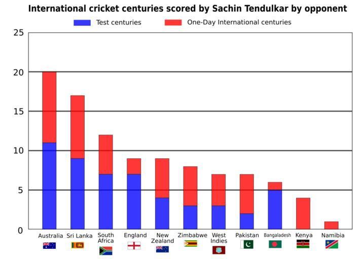 | Keywords: Sachin Tendulkar cricket centuries against countries.svg valid SVG inkscape 1 SVG version of File Sachin Tendulkar cricket centuries against countries JPG This bar graph shows the number of international cricket centuries scored by Sachin Tendulkar as of 16 March 2012 Created with Inkscape version 0 48 2 r9819 using data from List of international cricket centuries by Sachin Tendulkar List of centuries by year en wikipedia 2012-06-04 File Sachin Tendulkar cricket centuries against countries JPG <table class wikitable collapsible collapsed style width 100 ; font-size 90 ; margin 2px 0 > <tr> <th style background-color DDCDFF; text-align left >Flags have been obtained from the following files </th> </tr> <tr><td> File Flag of Australia svg File Flag of Sri Lanka svg File Flag of South Africa svg File Flag of England svg File Flag of New Zealand svg File Flag of Zimbabwe svg File WestIndiesCricketFlagPre1999 svg File Flag of Pakistan svg File Flag of Bangladesh svg File Flag of Kenya svg File Flag of Namibia svg </td></tr></table> Jpmeena on en wikipedia cc-zero Uploaded with UploadWizard Sachin Tendulkar |