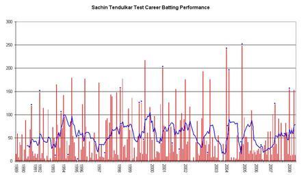 | Keywords: Sachin Tendulkar graph.png Sachin Tendulkar graph svg Test Match performance of Sachin Tendulkar It was created by Raven4x4x The red bars indicate the player's test match innings while the blue line shows the average of the ten most recent innings at that point Note that this average cannot be calculated for the first nine innings The blue dots indicate innings in which Tendulkar finished not-out This graph was generated with Microsoft Excel 2002 using data from Cricinfo http //stats cricinfo com/statsguru/engine/player/35320 html class 1;orderby start;template results;type batting;view innings and Howstat http //www howstat com au/cricket/Statistics/Players/PlayerProgressBat asp PlayerID 1735 The information in this chart is current as of 2 February 2008 2008-02-02 Own Raven4x4x wikipedia en derivative versions Sachin Tendulkar graph svg gallery 200 3 File Sachin Tendulkar graph svg SVG version also updated to include all innings upto 24 January 2012 Raven4x4x Original upload log page en wikipedia Sachin_Tendulkar_graph png 2008-02-02 07 46 Raven4x4x 986×574 7151 bytes <nowiki>This graph details the Test Match performance of Sachin Tendulkar It was created by Raven4x4x The red bars indicate the player's test match innings while the blue line shows the average of the</nowiki> Sachin Tendulkar Test cricketers graphs of India |