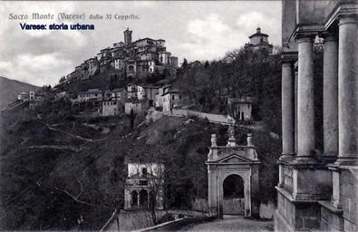| Keywords: Vista ripresa dall'undicesima cappella. Si notano la decima cappella (la Crocifissione) e il terzo arco (di Sant'Ambrogio) sopra il quale si intravede la cappella fallata lungo la via Fincarà e la quattordicesima cappella (l'Assunzione di Maria). In altro a sinistra l'abitato di Santa Maria del Monte con la stazione di arrivo della funicolare. varese sacromonte |