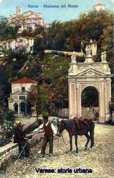 | Keywords: Immagine colorata. Elemosina tra la decima cappella (la Crocifissione) e il terzo arco (di Sant'Ambrogio) sopra il quale si intravede la cappella fallata lungo la via Fincarà e la cuspide della quattordicesima cappella (l'Assunzione di Maria). In altro a sinistra l'abitato di Santa Maria del Monte. varese sacromonte |