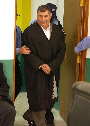 | Keywords: Saddam Hussein's former Defense Minister, Sultan Hashim Ahmad, in Baghdad, Iraq.jpg Baghdad Iraq Dec 18 2004 - An investigative hearing is held for Saddam Hussein's former Defense Minister Sultan Hashim Ahmad in Baghdad Iraq The hearing is part of the on going process held by the Iraqi Special Tribunal to bring former regime leadership to justice Presiding over the hearing is Chief Investigative Judge Ra'id Juhi of the Iraqi Special Tribunal U S Air Force photo RELEASED Source http //www news navy mil/view_single asp id 19817 PD-USGov-Military-Navy Sultan Hashim Ahmad al-Tai 2004 in Baghdad |