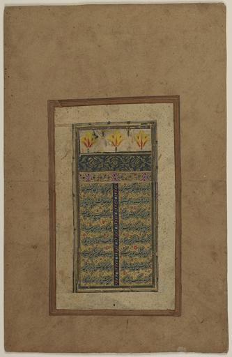 Keywords: Sadi1.jpg Script nasta'liq These calligraphic fragments are the first seven pages of Sa'di's Bustan The Fruit Garden or The Orchard The order of the first seven pages of this work all belonging to the same manuscript goes as follows Page 1 1-04-713 19 26 Page 2 1-04-713 19 15 Page 3 1-04-713 19 14 Page 4 1-04-713 19 12 Page 5 1-04-713 19 13 Page 6 1-04-713 19 11 Page 7 1-04-713 19 25 Page 1 Shaykh Sa'di d 691/1292 composed his famous and beloved Bustan in 1256-7 It contains histories personal anecdotes fables and moral instructions The first page provides a praise of God as an appropriate incipit to the text The first two lines read In the name of the Lord Life-Creating / The Wise One Speech-Creating with the Tongue / The Lord the Giver the Hand-Seizing / Merciful Sin-Forgiving Excuse-Accepting As in this case the first page of a Persian poetical text is easily recognizable as it is provided with an ornamental panel at the top sarloh and the main text usually is decorated by cloud band motifs and decorative illumination between the text and in the gutter separating each verse of poetry The top frieze contains three yellow flowers -- perhaps intended to represent blooming saffron flowers although the petals of saffron flowers tend to be of a light purple color -- as well as a blue horizontal band decorated with a gold leaf and flower motifs The yellow-orange flower reappears on an otherwise unrelated calligraphic fragment in the Library of Congress see 1-88-154 41 V This copy of the Bustan may have been produced in India during the 17th century The back of the second page 1-04-713 19 15 of this series includes a note supporting this provenance as it states that the work was written by 'Abd al-Rashid Daylami He was one of the famous calligraphers active at the court of the Mughal ruler Shah Jahan r 1627-1656 in Agra and Delhi ascs 009 century 17 Calligrapher 'Abd al-Rashid Daylami attr PD-old Other pages in this set <gallery> File Sadi2 jpg Page 2 File Sadi3 jpg Page 3 File Sadi4 jpg Page 4 File Sadi5 jpg Page 5 File Sadi6 jpg Page 6 File Sadi7 jpg Page 7 </gallery> Bostan Cloud bands |