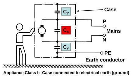 Keywords: Safety caps-Appliance Class I.svg de Erklärung der X und der Y Entstörkondensatoren Schutzklasse I own Elcap 2012-07-30 CC0 1 0 Cc-zero Vectorization Cleanup Zerodamage created with Inkscape Electrical safety Capacitors Film capacitors