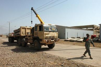 | Keywords: Safety fits to a 'T' DVIDS42641.jpg en Spanish Fork Utah native Sgt Jon Haymond a motor transport operator for Company A Hammers 615th Aviation Support Battalion 1st Air Cavalry Brigade 1st Cavalry Brigade guides a truck loaded with T-barriers to be unloaded during a project to make Soldiers safer at Camp Taji Iraq T-barriers help provide protection from indirect fires and sniper fire while working and living in the forward operating basses We want to keep our Soldiers safe to support the mission said Houston native Sgt Tiffany Bailey transportation platoon team leader for the Hammers U S Army photo by Spc Nathan J Hoskins 1st Air Cavalry Brigade Public Affairs 2007-04-27 Staff Sgt Nathan Hoskins https //www dvidshub net/image/42641 42641 2007-04-27 13 29 TAJI IQ PD-USGov Camp Taji Images from DoD uploaded by Fæ |