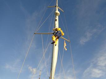 Keywords: sail mast leash repair perch wind sky summer sun sea sport risk adventure fear courage