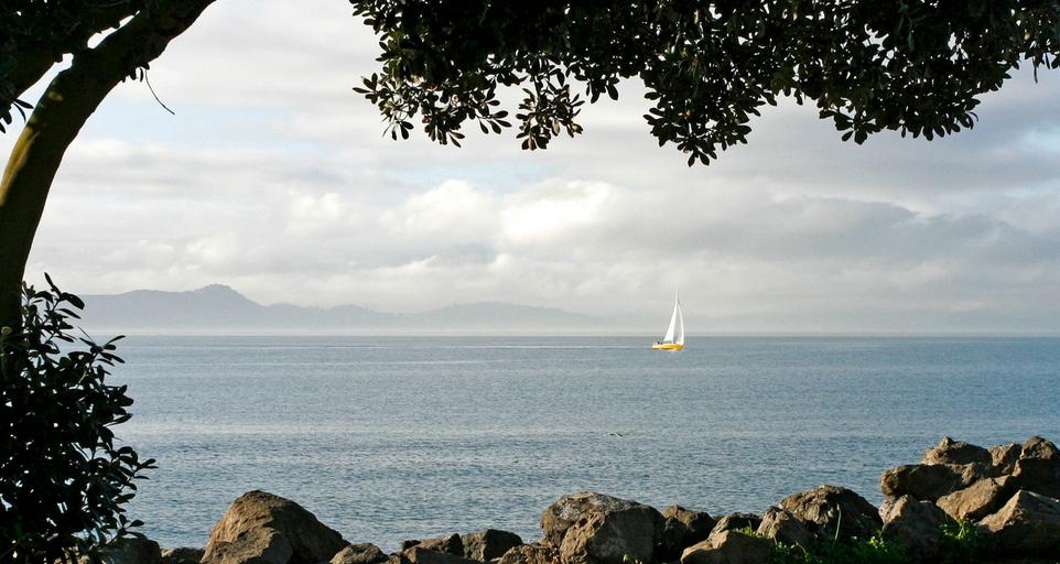Keywords: sailboat yellow sailboat trees san francisco bay clouds rocks boat sea water ocean sail tourism travel ship yellow sky summer nautical sunlight blue horizon sailing vacation activity seascape sport vessel yacht white