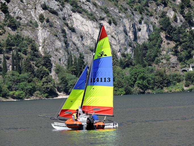 Keywords: sailing boat lake mountain rock green garda italy color colorful