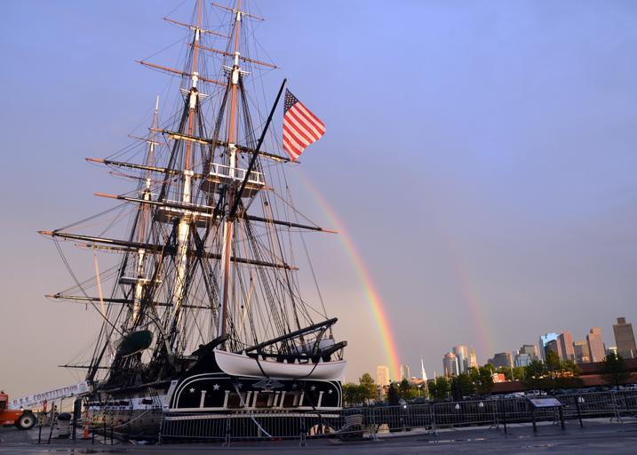 Keywords: sailing ship ship uss constitution rainbow frigate historic sky colorful scenic landscape sunny city urban harbor