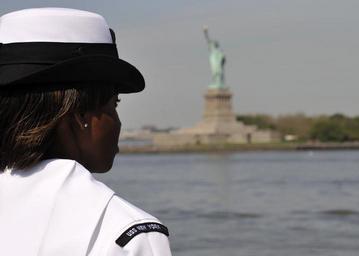 Keywords: sailor woman gazing observing statue of liberty landmark new york sea ocean maritime outdoors uniform shoulder behind water